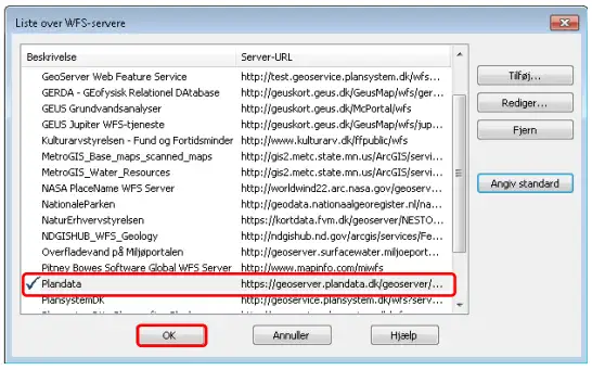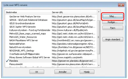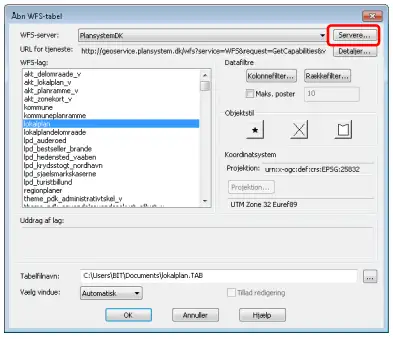 Vælg knappen ”Servere” for at indtaste URL adressen til WFS’en.