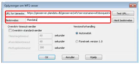 Indtast URL for WFS i øverste felt og derefter en beskrivelse, som du finder passende.