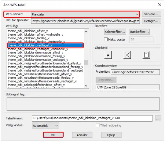 Vælg den nye WFS adgang du har oprettet, og tryk ”OK”.