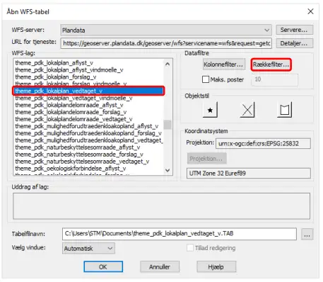 Når der er oprettet forbindelse til WFS’en og et lag er valgt, kan der trykkes ”Rækkefilter…”. I dette eksempel filtreres data både ved hjælp af kommunenummer og tid.