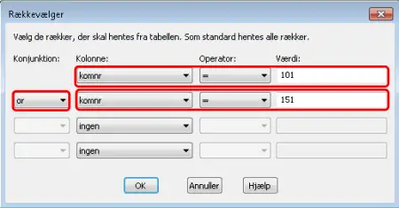 For at afgrænse indhentningen af data til en eller flere kommuner, vælges kolonnen ”komnr” og operatoren ”=”. I værdifeltet skrives det kommunenummer som skal være den afgrænsende faktor.
