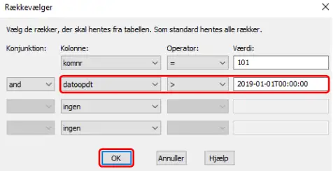 Filtreringen sker på baggrund af feltet ”datoopdt” eller ”oprettet” afhængigt af hvilket lag, der filtreres på. Klik på skrivefeltet ”Hvor” for at vælge rækken ” datoopdt” i dropdown-menuen ”kolonner”. Indtast den dato, der sidst blev indhentet data i formatet: '2019-01-01T00:00:00'