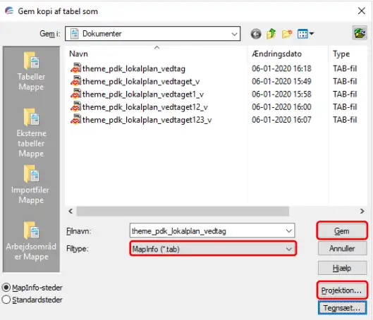 Vælg den ønskede ”Filetype” og ”Projektion” og tryk ”Gem”.