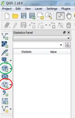 I QGIS kan WFS tilgås i venstre side af vinduet (rød cirkel) eller WMS (grøn cirkel), som vist herunder.