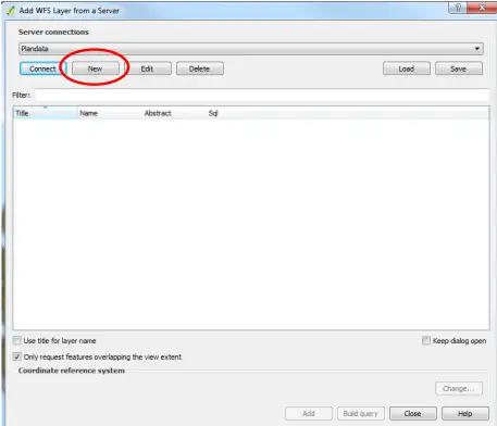 Der åbnes et nyt vindue hvor du kan administrere dine WFS services, tilføje nye, redigere eller slette eksisterende services. Ved oprettelse af en ny forbindelse, vælges knappen New, og et nyt vindue vil åbne sig.
