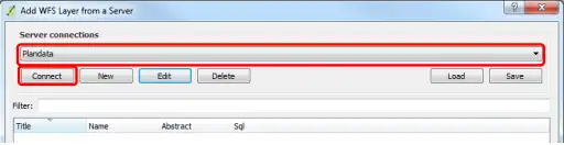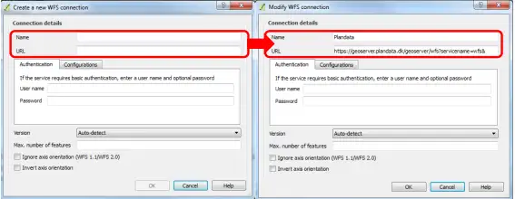 De to øverste felter i et nye vindue skal udfyldes med hhv. et valgfrit navn til din WFS og en URL-adresse til Plandata.