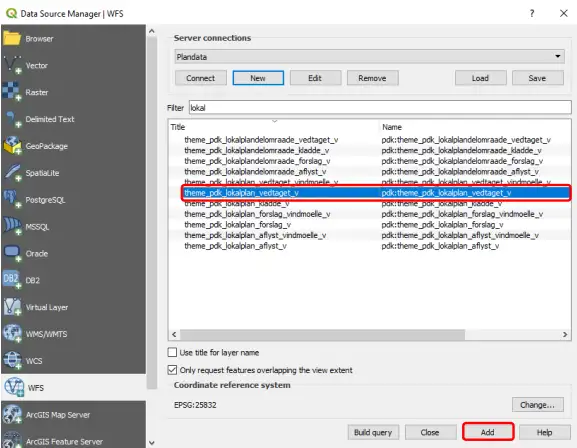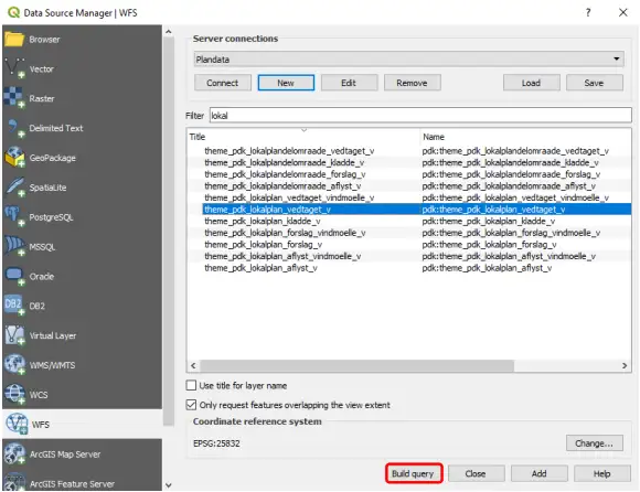 Hvis man ikke vil have et temalag for hele Danmark, er der mulighed for at begrænse søgningen indenfor én eller flere kommuner. Når der er oprettet forbindelse til WFS’en og laget er blevet valgt kan der trykkes Build query / Byg forespørgsel.