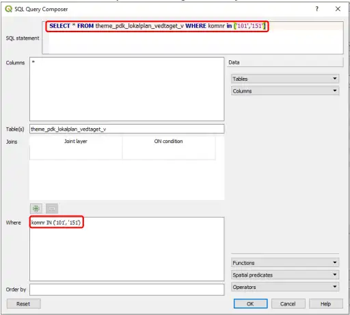 Klik på skrivefeltet Hvor / Where, hvor du skriver komnr = og derefter det ønskede kommunenummer. Forespørgslen bygges op i programmeringssproget SQL, og syntaksen ser således ud: