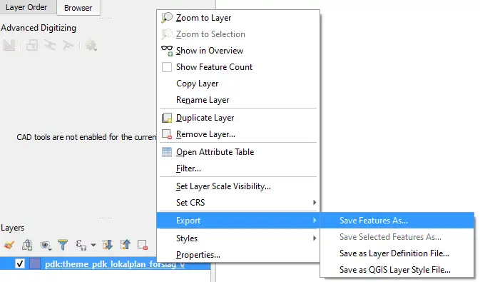 Dette gøres ved at højre klikke på laget i venstre side af vinduet og vælge Export / Eksportér og Save Features As / Gem Objekter Som.