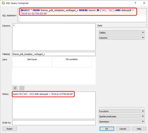 Filtreringen sker på baggrund af et datofelt som f.eks. datoopdt eller oprettet. Klik på skrivefeltet Hvor / Where og skriv det felt, du ønsker at filtrere efter, eller vælg det i dropdown-menuen Columns / Kolonner i højre side. Indtast den dato, der sidst blev indhentet data i formatet: