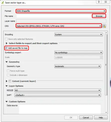 Gem nu i ESRI Shapefile, Mapinfo Tab, GML eller den filtype, du er vant til at arbejde med. Husk på at gemme i den rette projektion, EPSG: 25832 / UTM zone 32N.